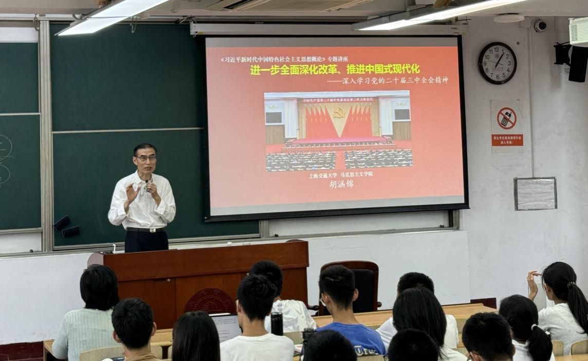 为学习贯彻党的二十届三中全会精神,阐释好《中共中央关于进一步全面深化改革 推进中国式现代化的决定》,让青年学生进一步了解中国改革事业的光荣历史,自觉围绕推进中国式现代化这个主题贡献青年力量,9月26日下午,幸运28 原副院长、学院关工委副主任、优秀思政教学名师胡涵锦教授走进“习近平新时代中国特色社会主义思想概论”课堂,幸运28 张玲教授主持,近100名学生参加此项教学活动。